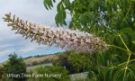 Deciduous tree. Moderate growth with spreading canopy. Large white spikes of fragrant spring flowers. Large seeds appear in fall. Loses leaves during summer in the wild, but will hold until fall with moderate water. Silver bark tree structure is showy even when bare. California native. Attracts butterflies and humming birds. Drought tolerant once established.