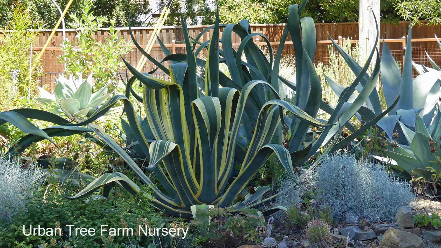Evergreen shrub. Large blue-green blades with variegation and hooked edges. Mature plants will produce 15-40′ flower stalks. Low water needs once established.