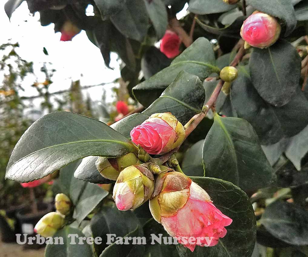 Evergreen shrub. Pruned into a small, single trunk tree. Slow growing. Upright, spreading habit. Dark green, glossy foliage. Medium to small semi-double blooms are rosy red and appear int the middle of winter through spring. Likes moist but well-drained acidic soil.