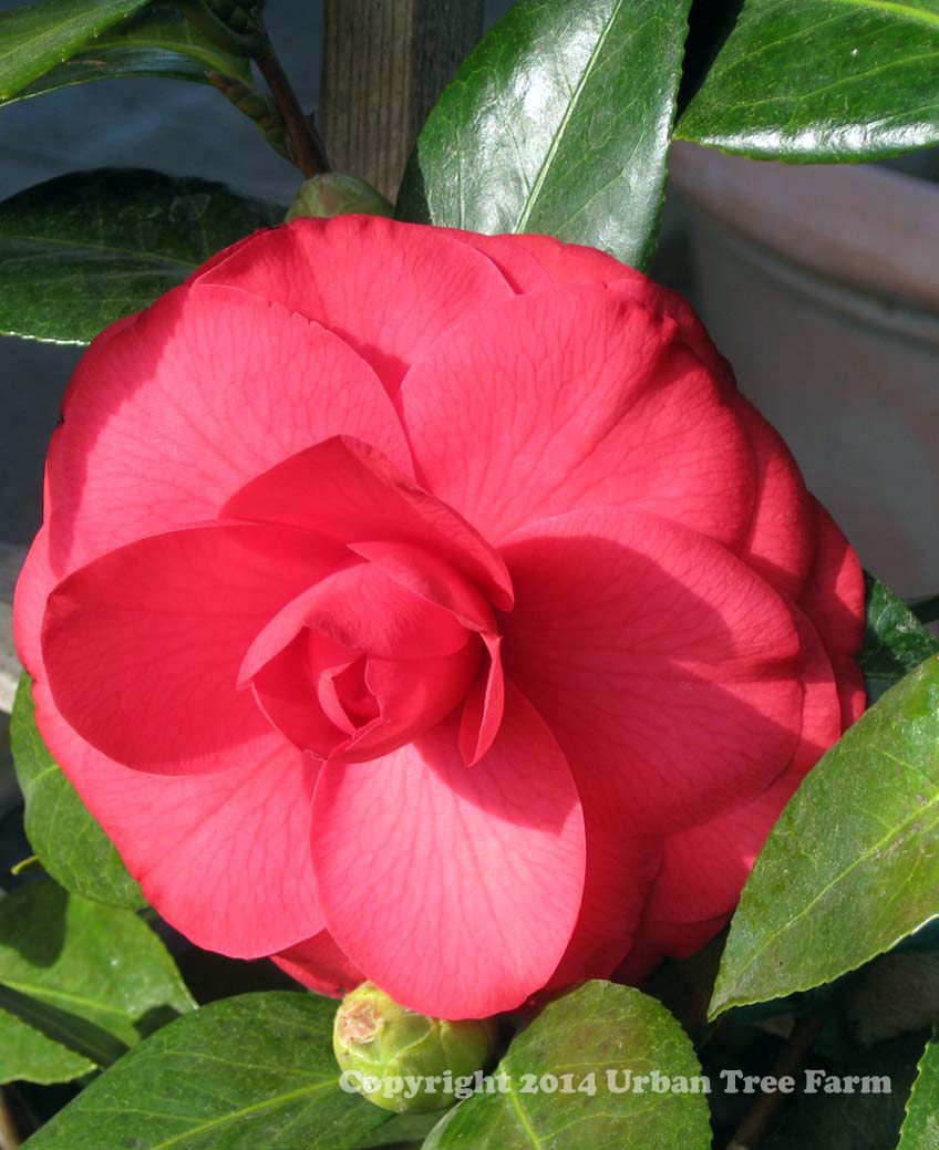 Evergreen shrub. Slow growth. Dark green, glossy foliage. Upright, compact habit. Very large, formal double blooms are crimson with a purple cast. They appear mid to late winter into the spring. Likes moist but well-drained acidic soil.