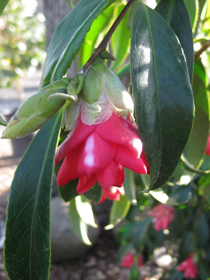 Evergreen shrub. Glossy green leaves contrast with beautiful, semi-double form weeping flowers. Blooms are maroon centered, transitioning to red and finally a white-edged border. Likes moist but well-drained acidic soil.