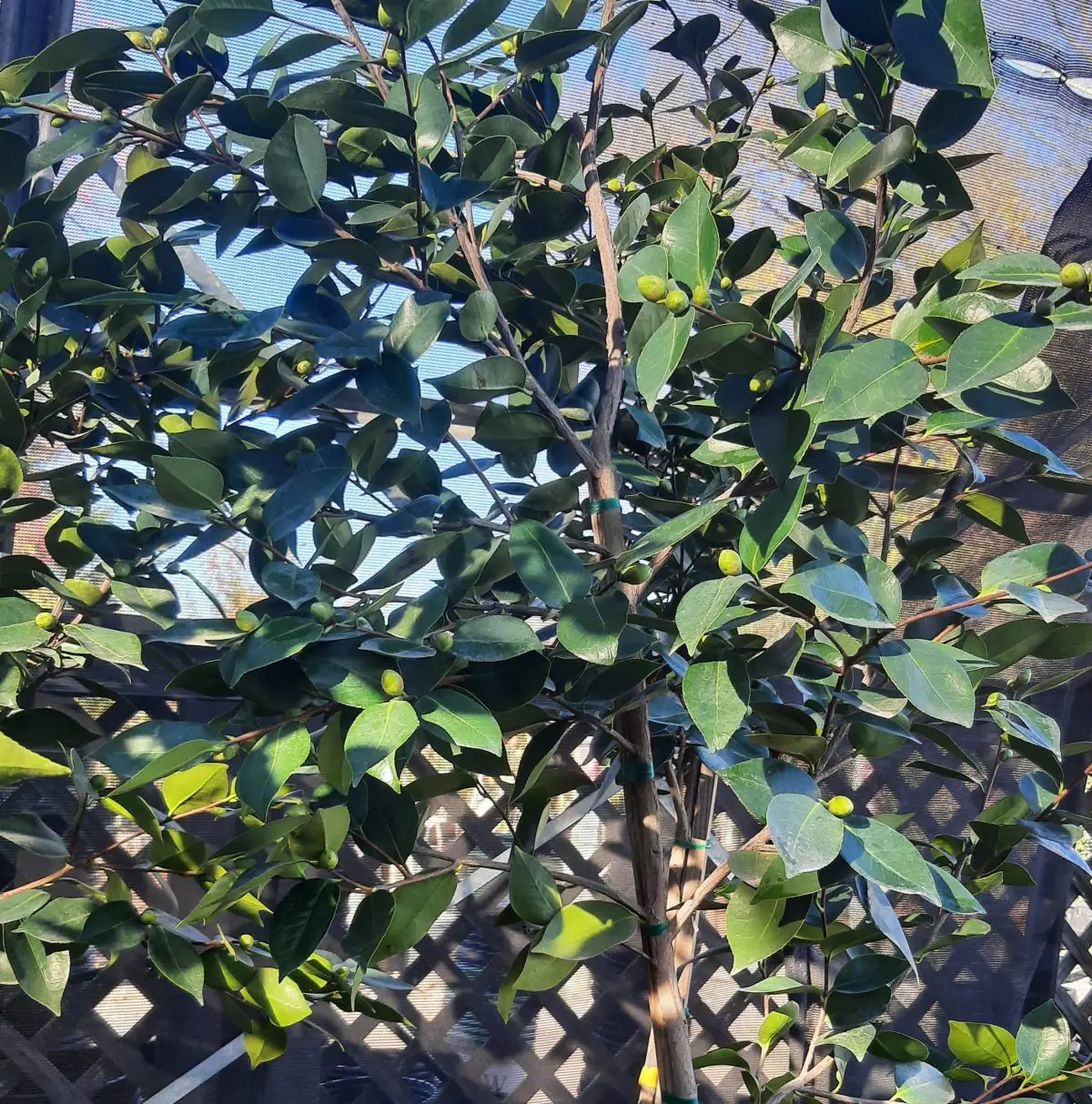 Evergreen shrub. Slow growth. Glossy, dark green foliage. Snow white, very large blooms with a semi-double, peony form. Blooms mid winter into early spring. Likes moist but well-drained acidic soil.