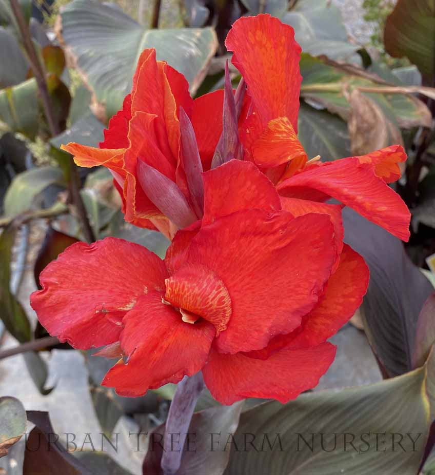 Deciduous perennial. Evergreen in mild winter areas. Create bold tropical effects with these easy-care plants that spread slowly by rhizomes. Rich scarlet-red tropical looking flowers with dark bronze-chocolate leaves. Blooms late spring or early summer into fall. Regular to ample water needs during growth and bloom.
