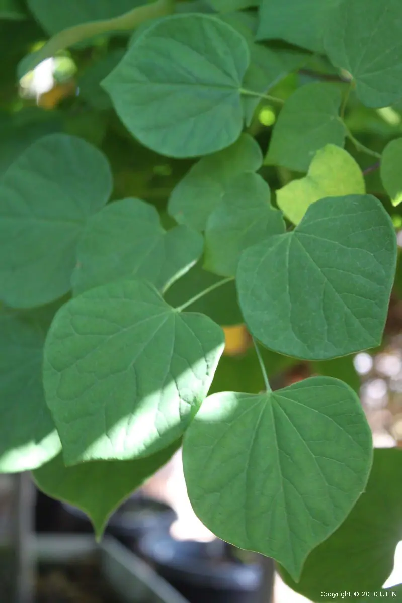 Deciduous tree. Moderate growth rate. Round headed canopy. Profusion of small magenta-pink pea shaped blooms on large branches in April. Large rounded heart-shaped leaves turn yellow in fall. Moderate water needs once established.