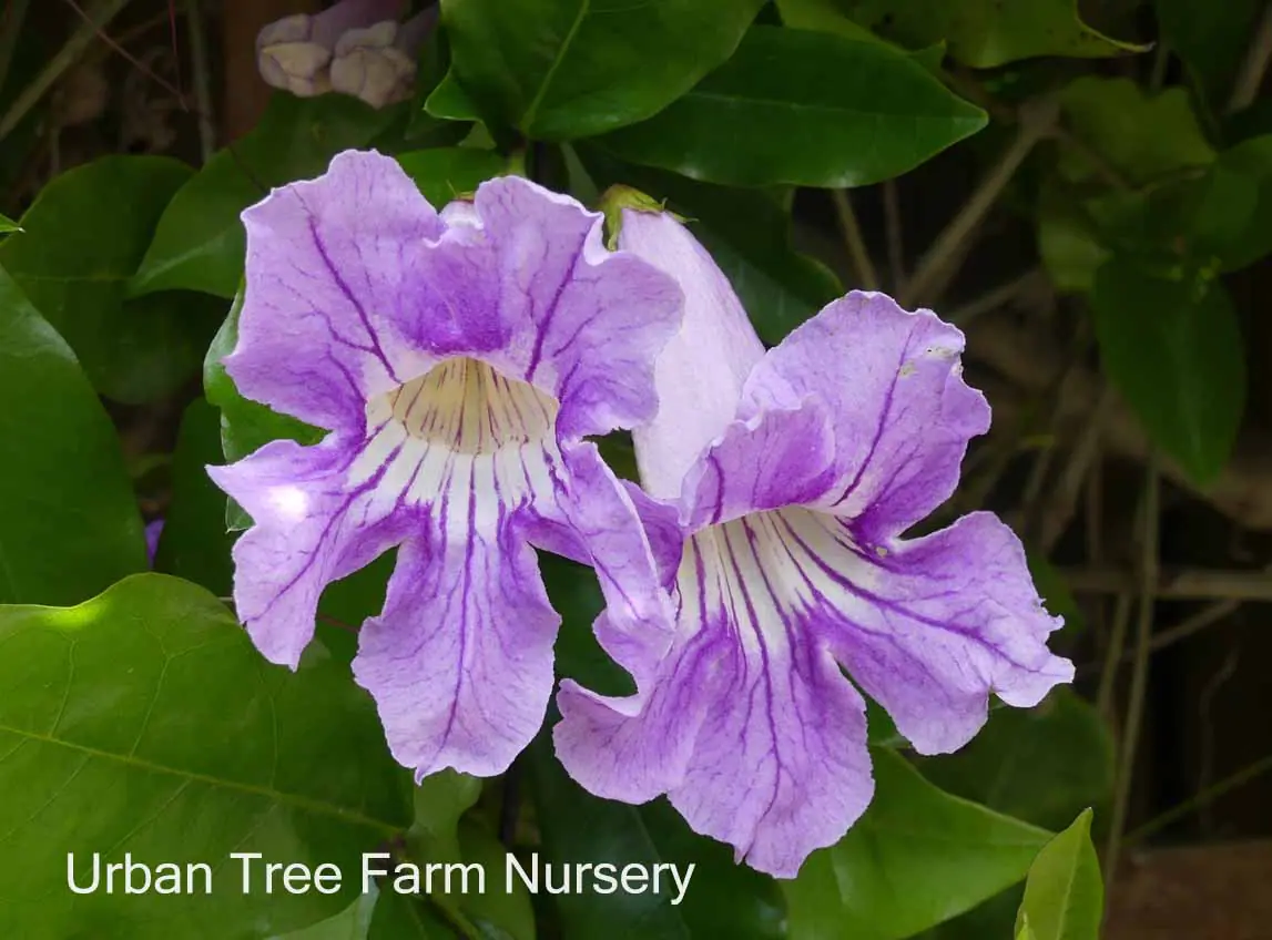 Evergreen vine. Moderately fast growing. Needs support structure. Medium sized lavender trumpet-shaped flowers from late spring to fall. Glossy green foliage. Moderate water needs once established.