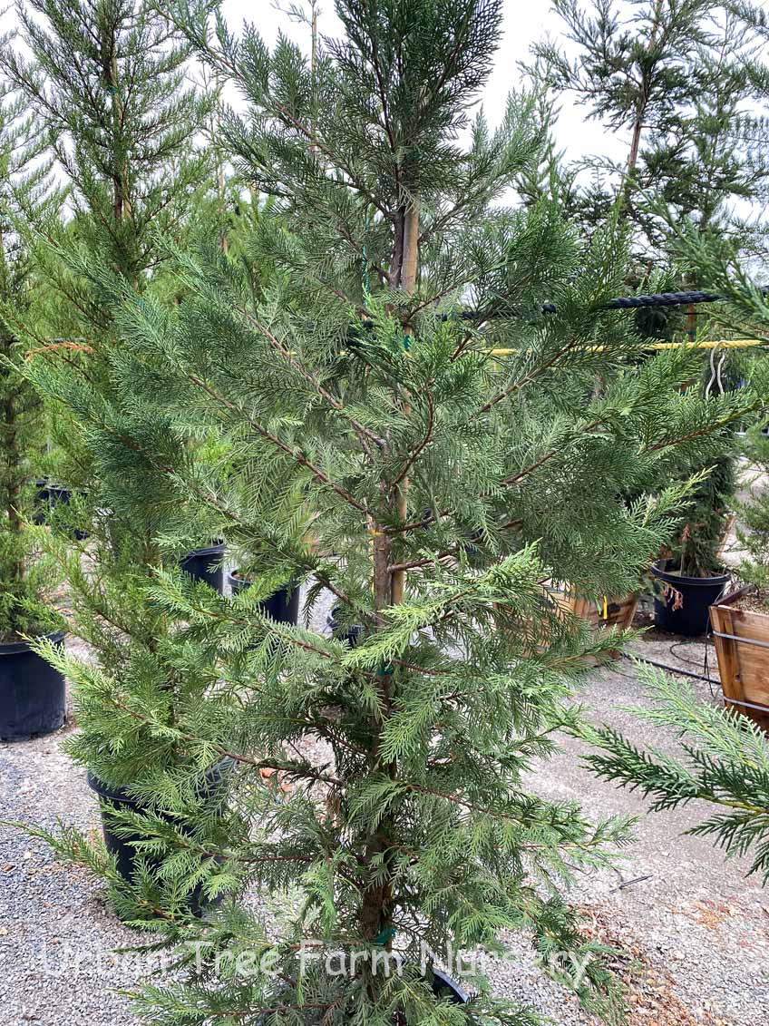 Evergreen tree. Very fast growing. Somewhat open pyramidal form. Large branches with flattened groups of gray/green foliage. Tolerant of ocean winds and salt spray. Short-lived in hot summer areas (15-20 years). Moderate water needs once established.