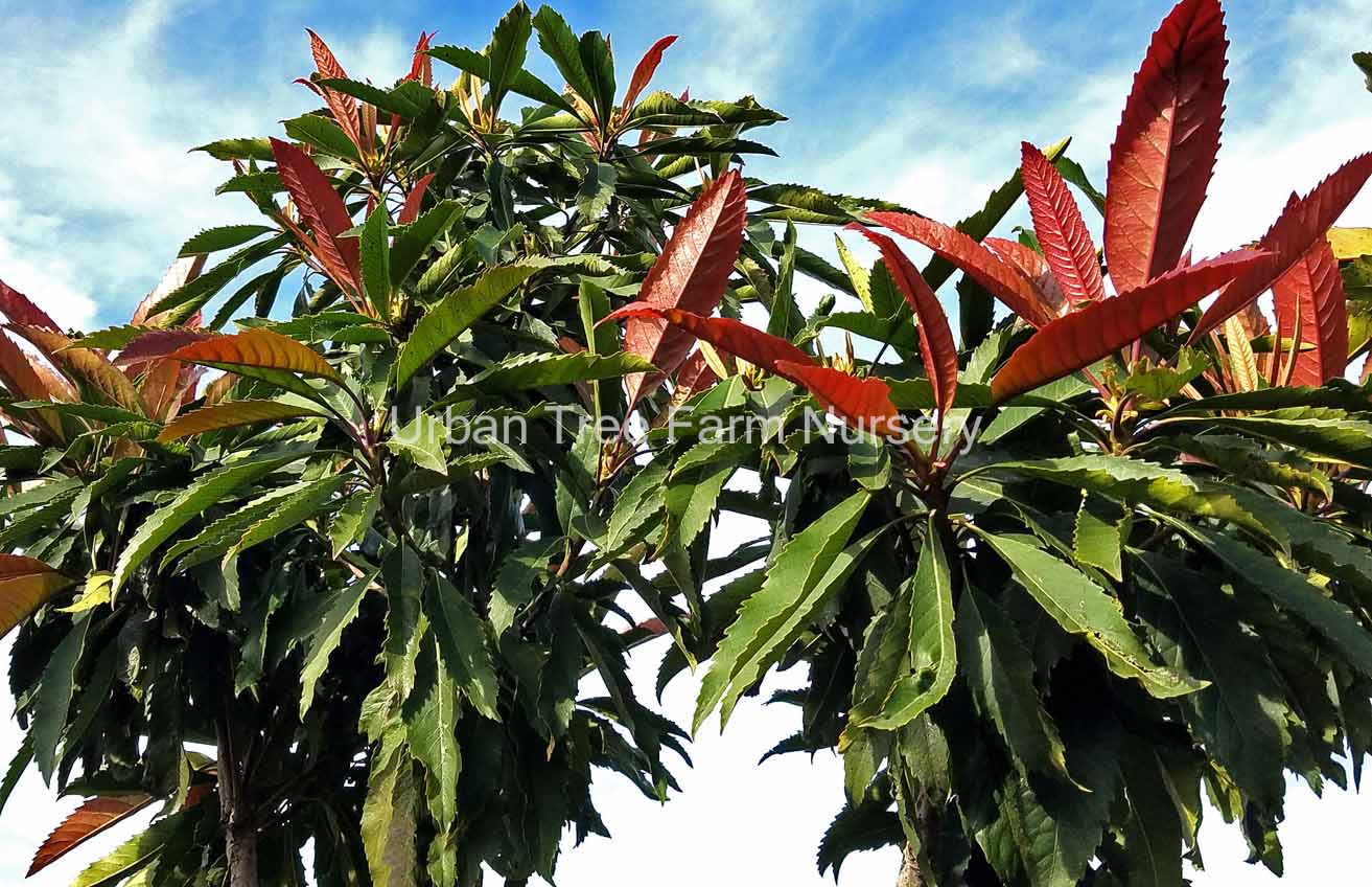 Evergreen tree. Fast growth. Round canopy. Dark green leathery leaves. New leaves are bronze colored. Tropical effect. Small, fragrant white flowers in fall. Apricot-colored fruits (not edible) in winter/spring. Moderate water needs once established.