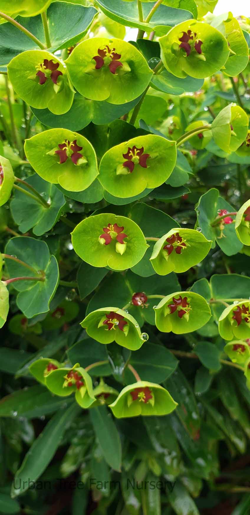 Evergreen perennial. Dark green leaves have hints of purple on this compact form of Euphorbia martini. Leaves turn red in colder weather. Tough relative of Christmas Poinsettia. Interesting cup-shaped yellow-green” flowers” are held above foliage on red stems and bloom in late spring through summer. Deer resistant. Low to moderate water needs in well-drained soil once established. Hardy to 0°F or below.
