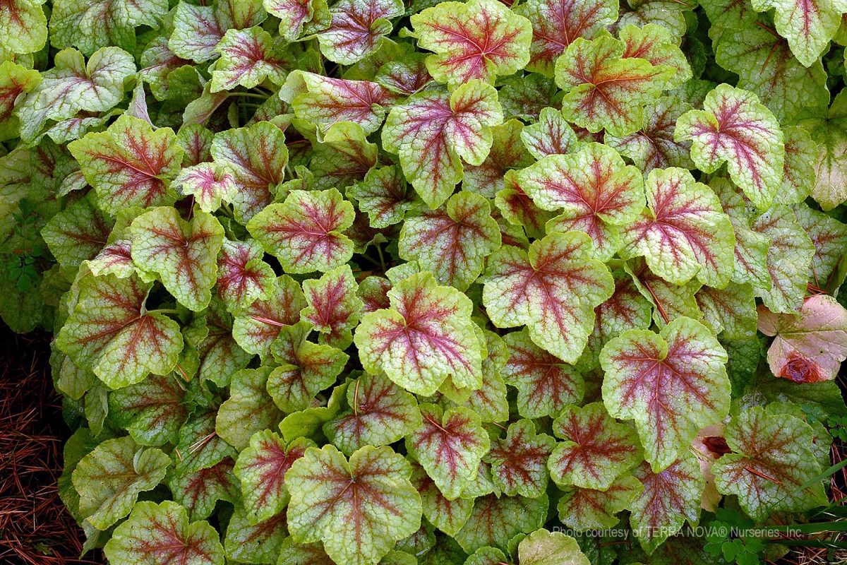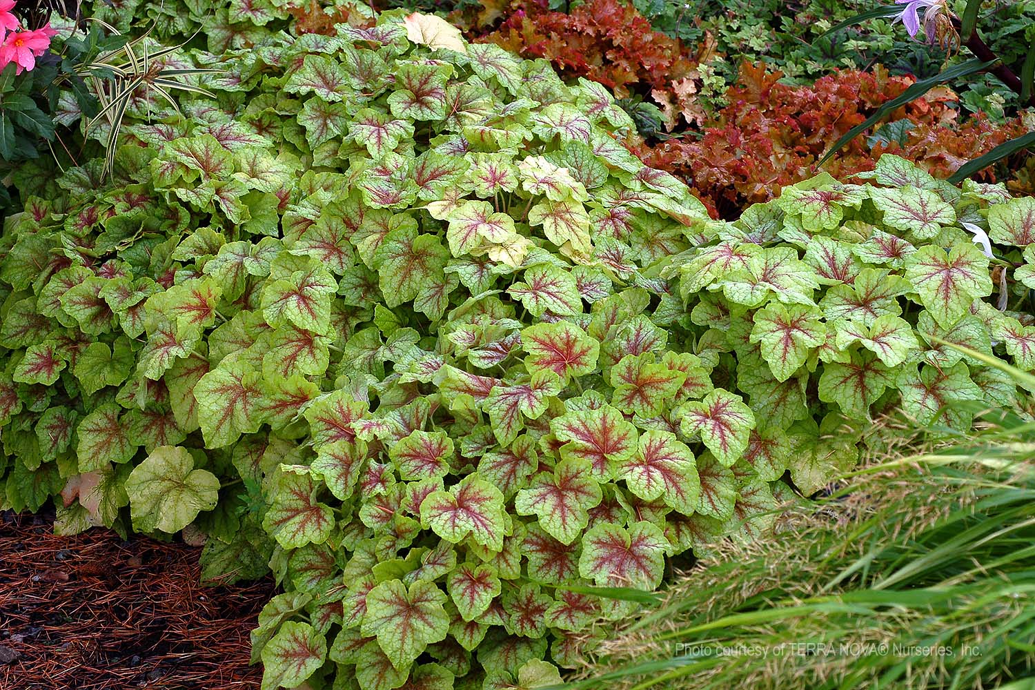 Evergreen perennial. Appealing maple-shaped light lime green leaves with bold red veins grow into compact low mounds. In autumn, foliage shifts into beautiful shades of dark reddish-green. Great for adding color to shade gardens, or statement mass plantings. Delicate white flower stalks rise above the foliage and bloom midsummer. Deer resistant. Moderate water needs once established; do not let dry out between watering. Requires good drainage. Hardy to 0°F.