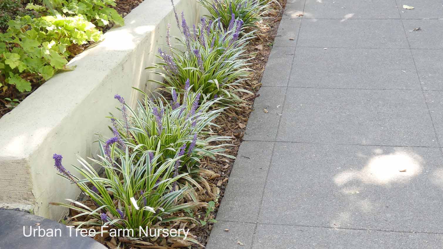Evergreen perennial. Not Sunproof – best in shady areas. Beautiful grass-like green and creamy white striped foliage grows in dense clumps, great in mass plantings. Soft lilac flower spikes bloom in summer. Easy to grow. Deer resistant. Moderate water needs once established. Adapts to a variety of soil conditions; but requires good drainage. Hardy to 0°F.