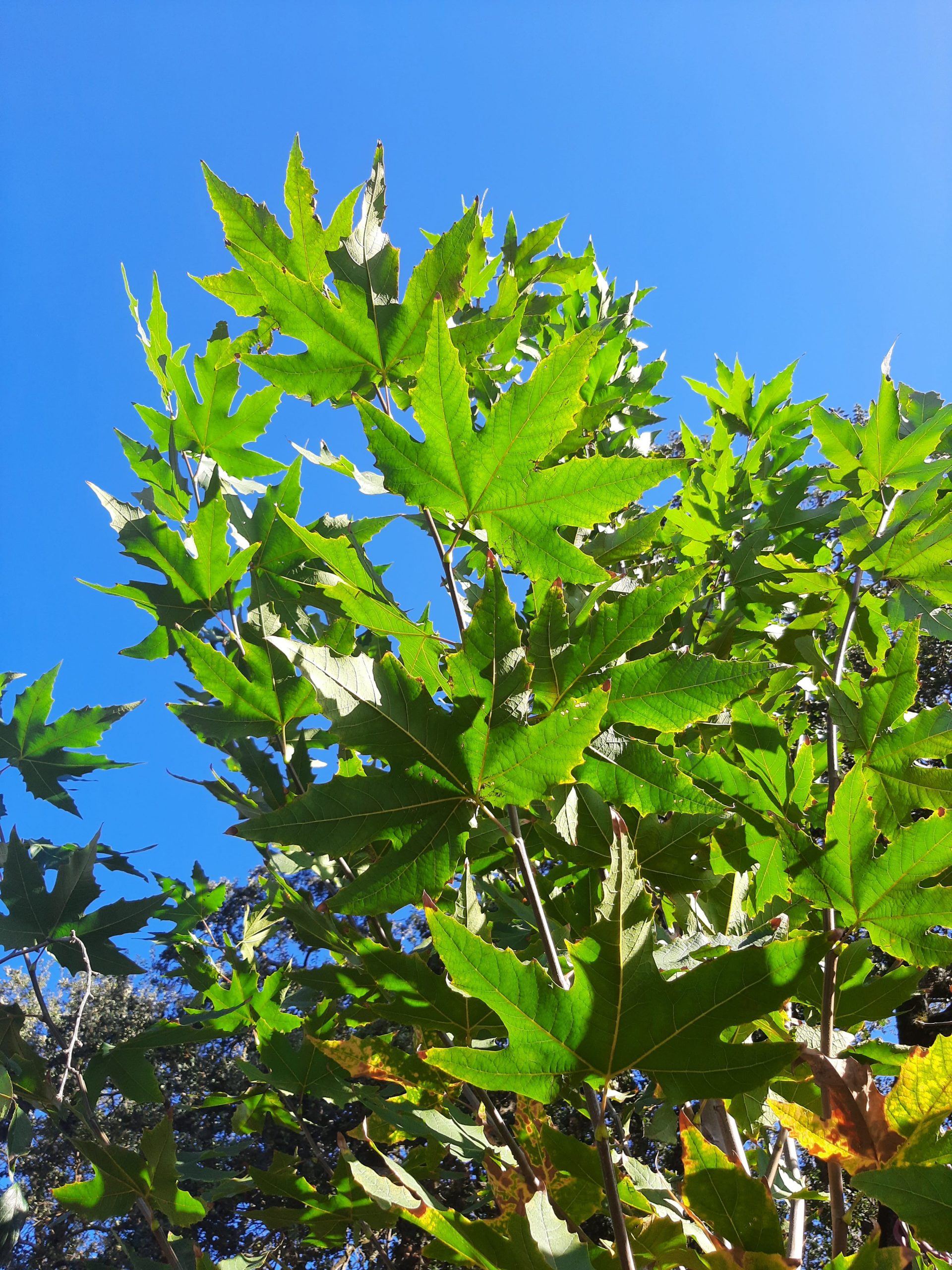 Deciduous tree. This specimen has a straight, central trunk with branching starting closer to the base of the plant. Fast growing. Big round-headed canopy. Very big medium-green palmate leaves with pointed tips. Attractively mottled bark. Brown ball-shaped seed clusters. California native. Low water needs once established.