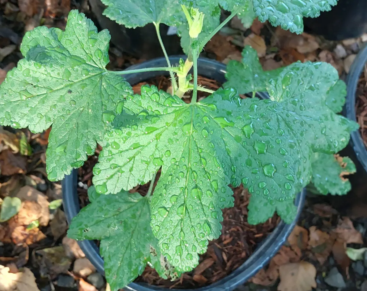Deciduous shrub. Loosely branched, upright shrub. Leaves are palmately lobed and serrated, dark green. Flowers are small, red, and tubular borne in long, showy racemes. Dark blue, pea-sized berries covered with stalked glands and white waxy bloom; edible but unpalatable. Young twigs are round, green becoming smooth and reddish brown with age. Bark is reddish brown to grayish brown. Little to moderate water needs once established.