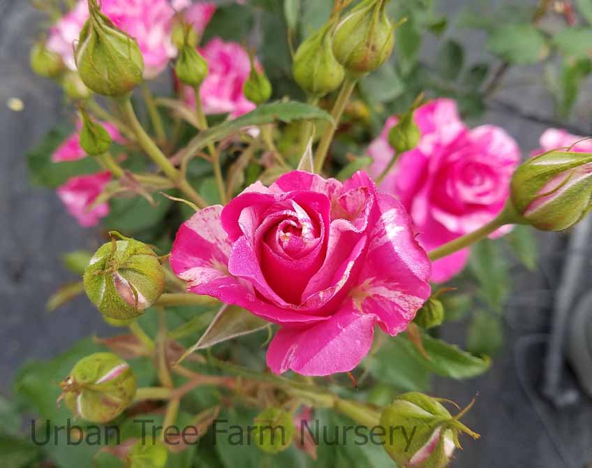 Deciduous shrub pruned into a small tree rose. Upright, bushy habit. Good disease resistance. Glossy dark-green, toothed and textured foliage. Spiraled, formal double grandiflora flowers are mostly hot pink with a swirl of white. Strong, citrus and spice fragrance. Blooms in warm weather, usually summer into fall. Moderate water needs in well-drained soil once established.
