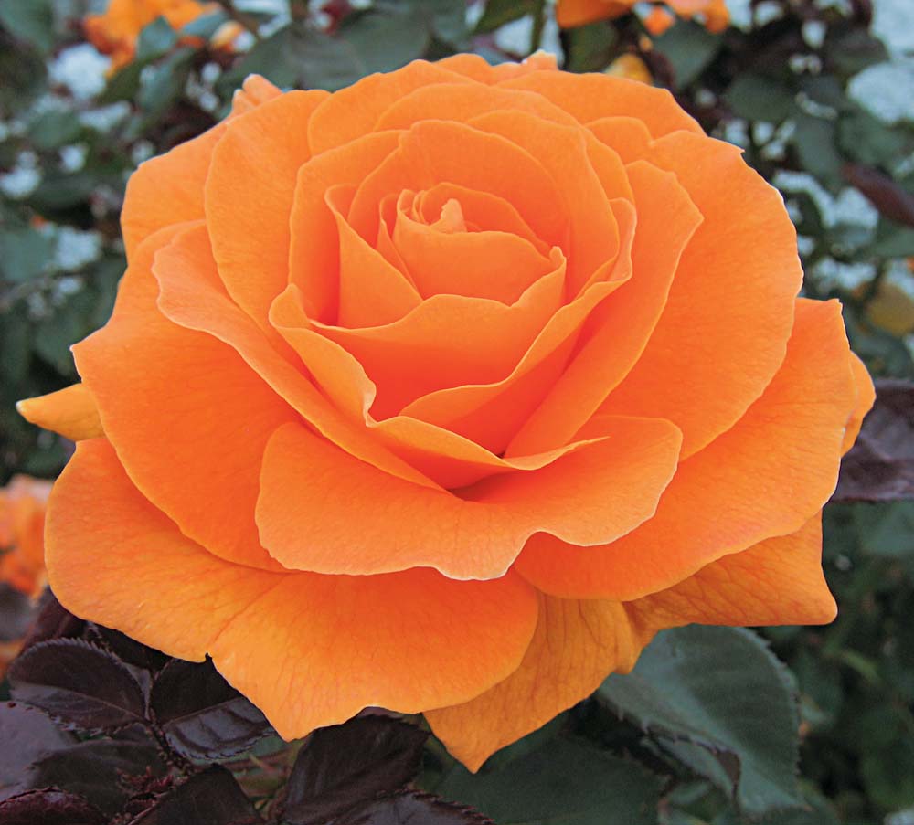 Deciduous shrub pruned into a small tree rose. Its bright orange juice tones of glowing color last to the very end of every long lived blossom. Deep mahogany red new growth and glossy green leaves. Rounded compact plant. Moderate water needs in well-drained soil once established.