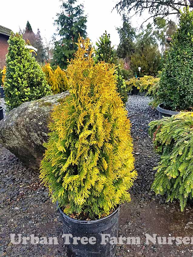 Evergreen conifer. Dense, pyramidal habit. Golden foliage does not bronze in winter. Moderate water needs in well-drained soil once established.