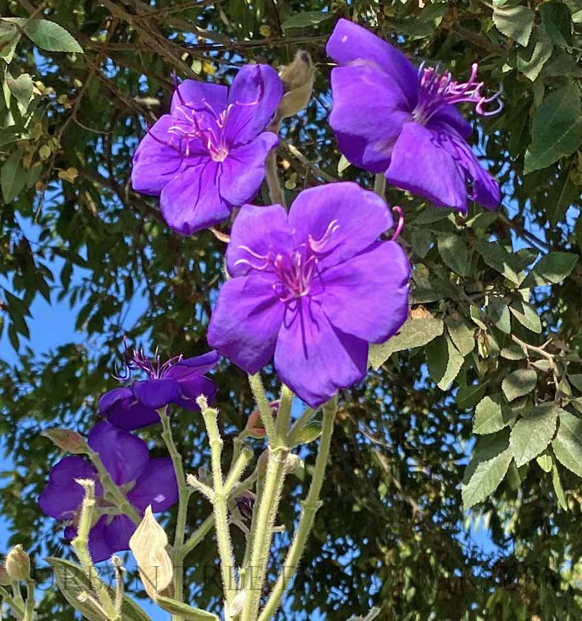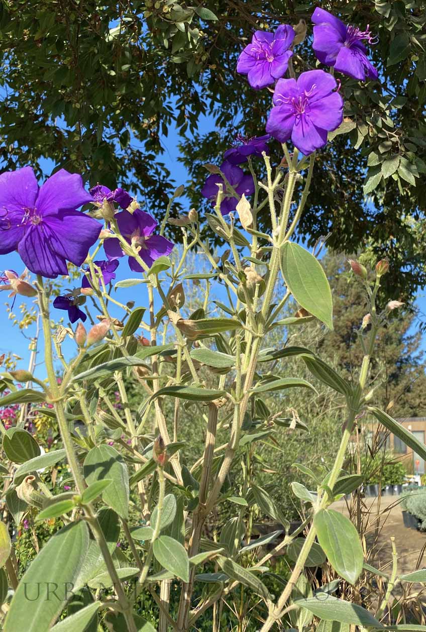Evergreen shrub. ONLY HARDY TO 25-30° F. ribbed leaves are oval and new foliage is covered with velvety red hairs. A spectacular bloomer with its rich royal purple five-petaled 2-3 inch flowers at the ends of the branches in the spring through fall. Plant in light shade and well-drained soil. Regular water needs once established.