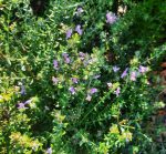 Evergreen shrub. Compact, dense rounded form. The small bluish-purple flowers bloom along the branches year-round in mild climates (spring-bloomer in colder areas). Linear dark gray-green leaves look similar to rosemary foliage, although it is not fragrant. Drought tolerant once established but keeps better color and remains more dense when given occasional spring and summer irrigation.